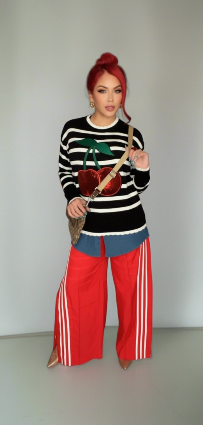 Meet our Cherry Striped Sweater, in black/white color, casual look, playful,