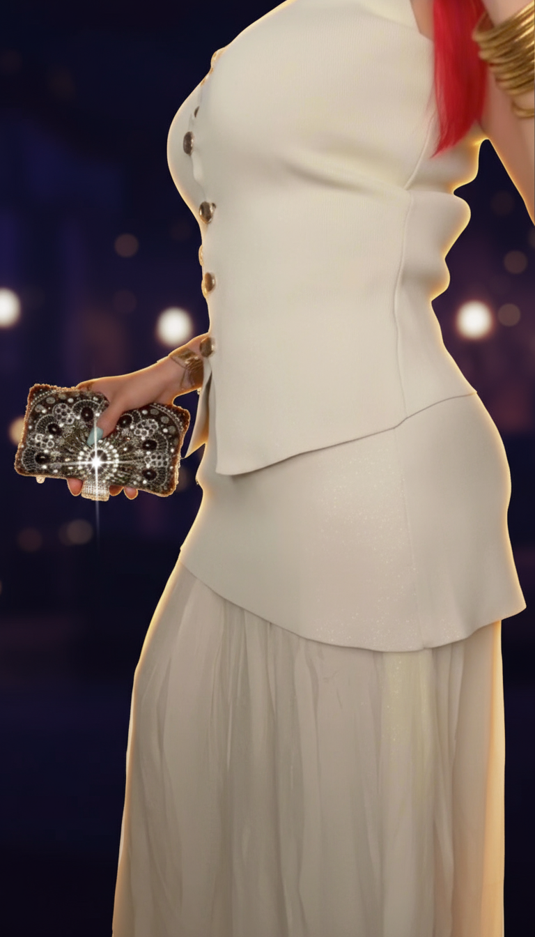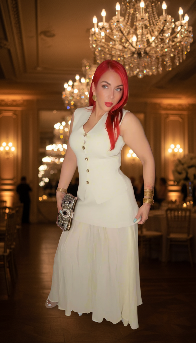The LOLA Skirt Set features a sophisticated design with a layered look, a long skirt elegantly built into a shorter overlay, offering versatile styling options. Paired with a sleeveless vest top accented by refined gold buttons, this set combines classic tailoring with contemporary flair, perfect for making a polished statement. Model wearing size L, runs true size, stretch.