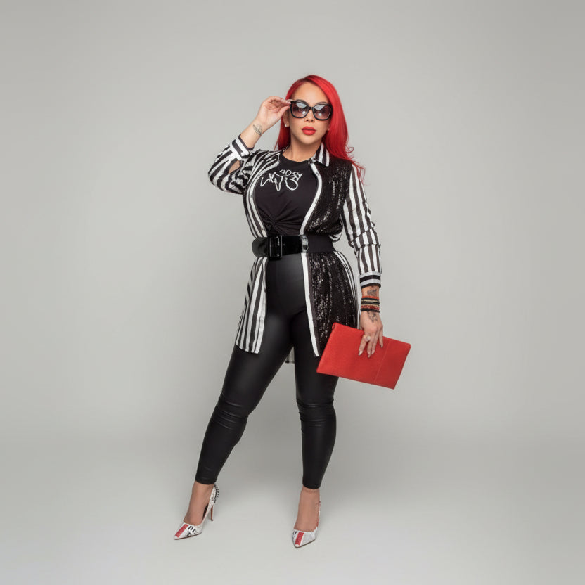 Elevate your wardrobe with this striking shirt dress that seamlessly blends two distinct aesthetics. One side features classic stripes while the other showcases shimmering sequins, creating a dynamic look that transitions effortlessly from day to evening. Designed with functional long sleeves and a practical left-side pocket, this dress offers both style and utility. The model pictured wears a size medium, and this dress runs true to size. Available in S, M, and L.b(relaxed fit). Model is wearing size Medium.